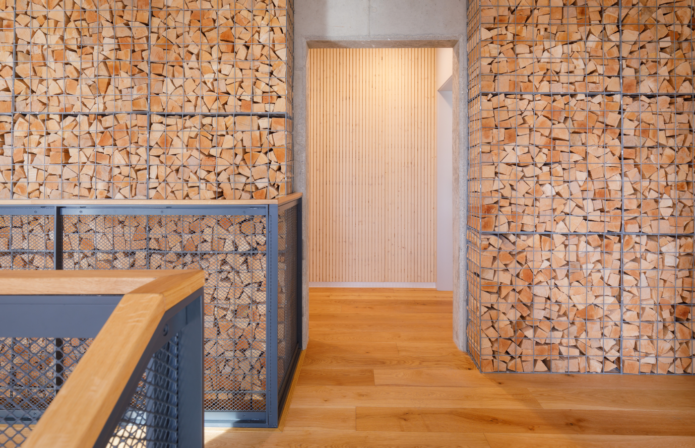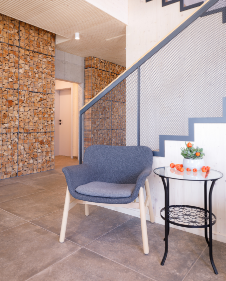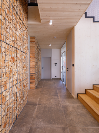 Cez obidve podlažia prechádza stena z pohľadového betónu, ktorá má nosnú aj akumulačnú funkciu. Stena je zároveň nosičom hlavného výrobného produktu firmy – palivového dreva, ktoré je usporiadané v gabiónových košoch. Centrálnym bodom celej budovy sú kachle umiestnené v centre budovy. Hlavným konštrukčným materiálom administratívnej budovy je kombinácia líniových konštrukčných prvkov a lepených drevených panelov Novatop, ktoré tvoria zároveň pohľadové plochy v interiéri. Súčasťou nosnej konštrukcie je aj betónová stena v centre dispozície.