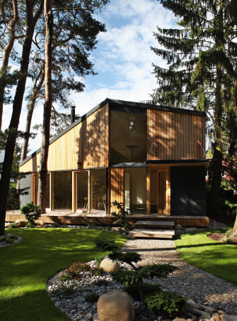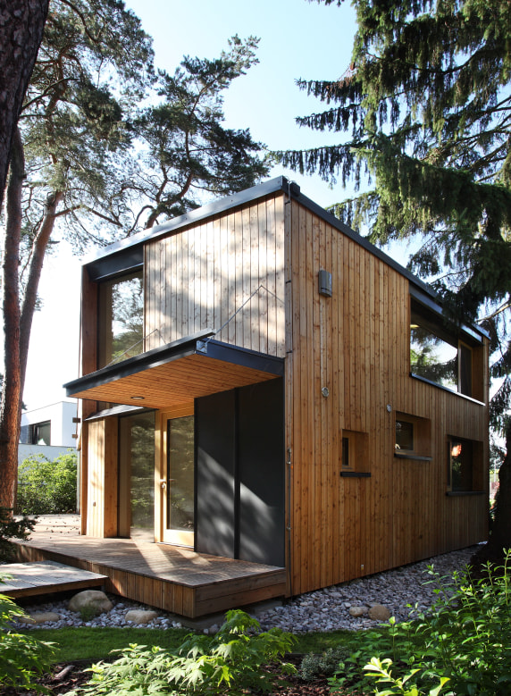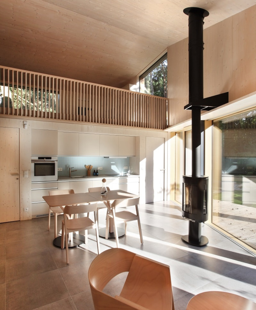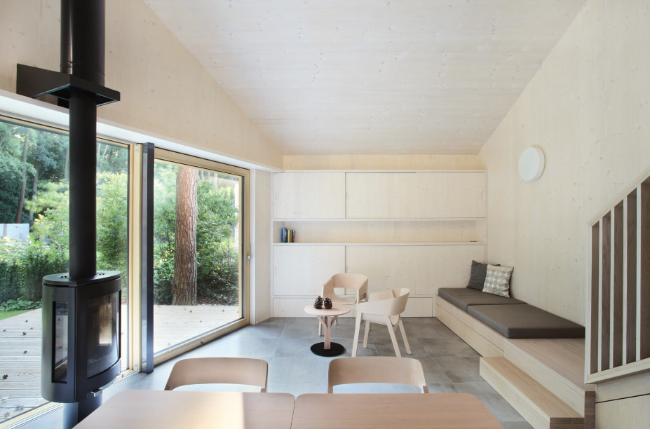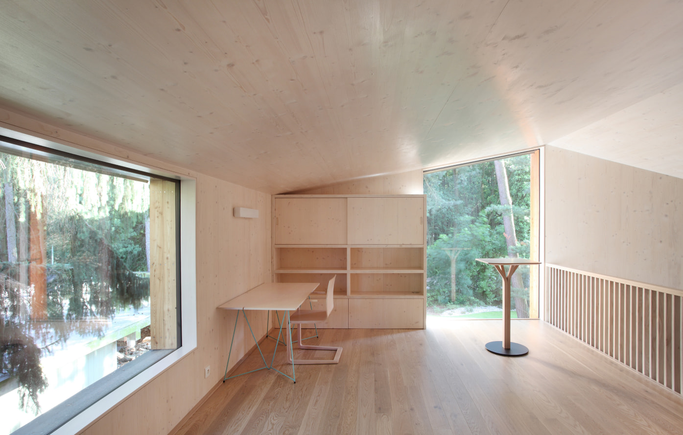 Od počátku jsme k návrhu ateliéru přistupovali velice citlivě s důrazem na design a jednotlivé detaily. Tomu odpovídá jak řešení hmoty objektu, dřevěných fasád, oken s bezrámovým zasklením, tak realizace celého interiéru na míru. Většina interiérových prvků je vyrobena ze stejného materiálu, ze kterého je postavena nosná konstrukce domu – smrkové masivní dřevěné panely. Nosné stěny se tak krásně prolínají s vestavěnými prvky nábytku a tvoří jeden celek.