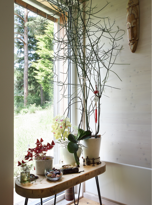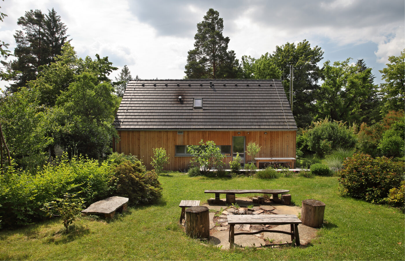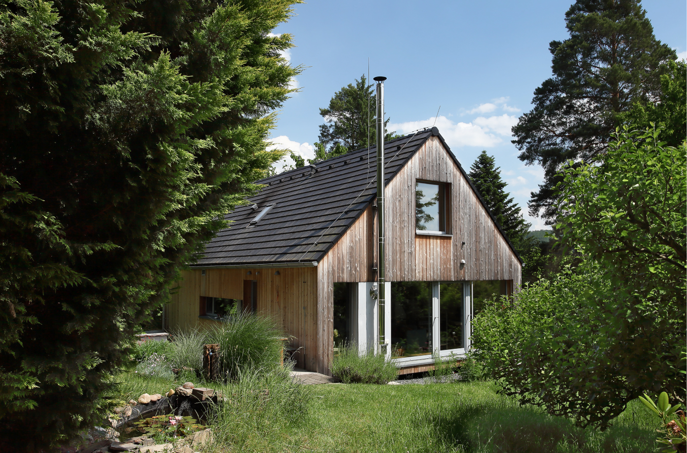 Dům jsme umístili na dolní část pozemku, kde tvoří pomyslnou zástěnu od přístupové cesty, čímž zajišťuje soukromí v původní a doslova kouzelné zahradě. Je zarostlá množstvím kvetoucích keřů a ovocných i jehličnatých stromů, a nechybí zde příjemná zákoutí s posezením u ohniště, u jezírka s lekníny, nebo ve stínu stromů.