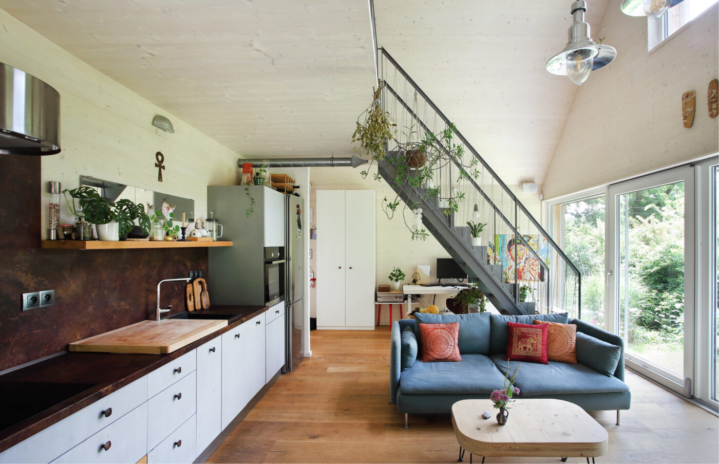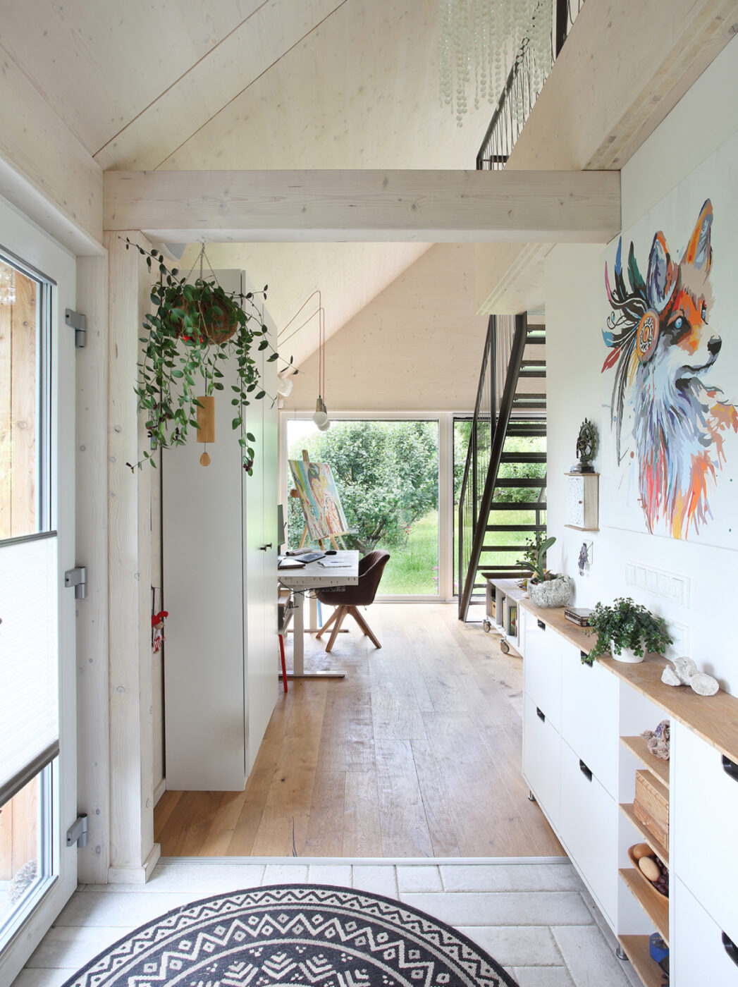 Na první pohled má dům oproti standardní verzi Freestyle terasu umístěnou podél domu – směrem do zahrady. Ke úpravám návrhu došlo i ve vnitřní dispozici. V přízemí se vpravo od vchodu nachází dva samostatné pokoje – jeden slouží jako pracovna a druhý jako ložnice. Naproti je v rámci jádra domu umístěná samostatná toaleta, technická místnost, šatna a koupelna s podélným oknem směrujícím do zeleně. V hlavní obývací místnosti je velkorysá kuchyňská linka, v prostoru se nachází sedací souprava a jídelní stůl a na protější straně pracovní kout majitelky domu.