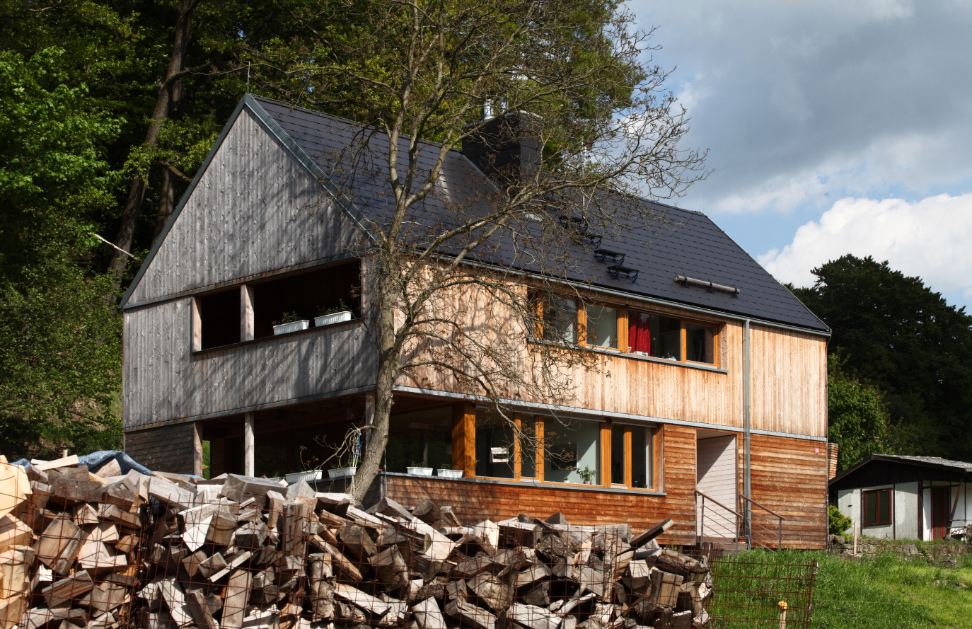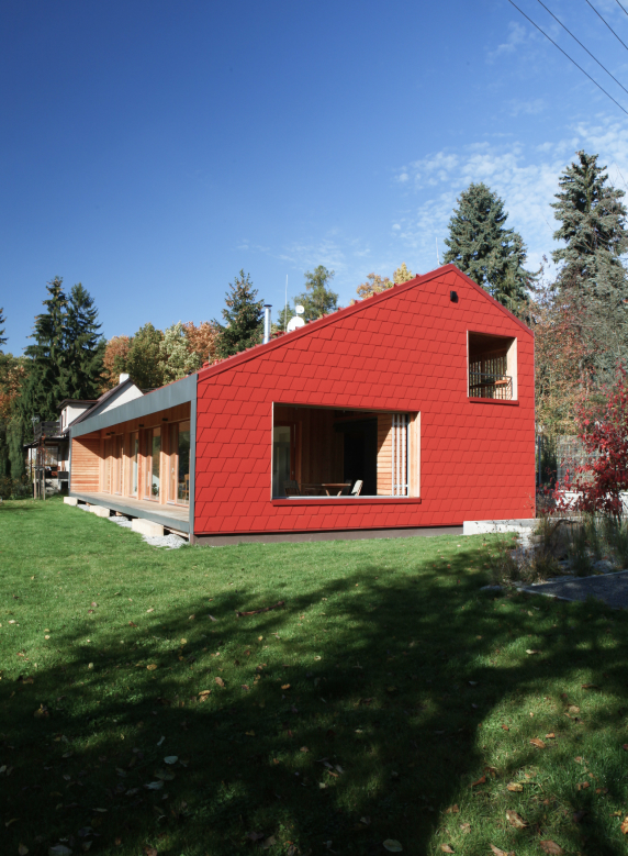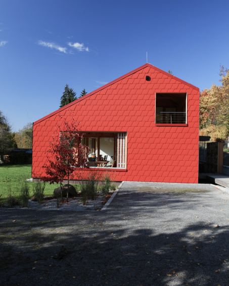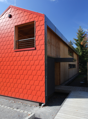 Koncept uspořádání – „dům v domě“ – se projevuje i na fasádě. Obklad vnějšího domu je stejný na svislých stěnách i střeše – tvoří ho maloformátová krytina z cembonitových šablon v cihlově červené barvě, které jsou diagonálně skládané. Oproti tomu vnitřní objekt má fasádu z dřevěných palubek skládaných vertikálně, s výraznou spárou. Oplechování a lem přesahů domu jsou tmavě šedé antracitové barvy.