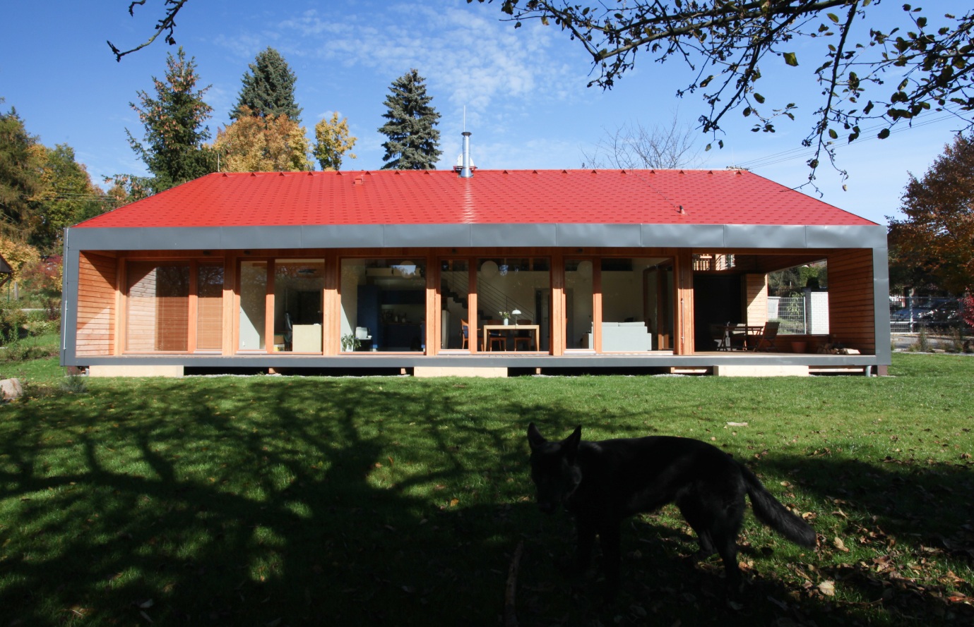 Jižním směrem do zahrady je dům otevřený prosklenou fasádou. V přízemí se nachází všechny obytné místnosti, hygienické zázemí i technická místnost. V druhém, podkrovním podlaží je pokoj pro hosty a prostor u schodiště, propojený s obývacím pokojem v přízemí. Dům představuje jakýsi "dům v domě" - objekt vestavěný do zahradní stavby. Vznikla tak rozsáhlá krytá část teras a vstupu z jižní a východní strany. Vnitřní dům tím získal větší intimitu a zároveň ochranu před přímým letním sluncem a povětrnostními vlivy.