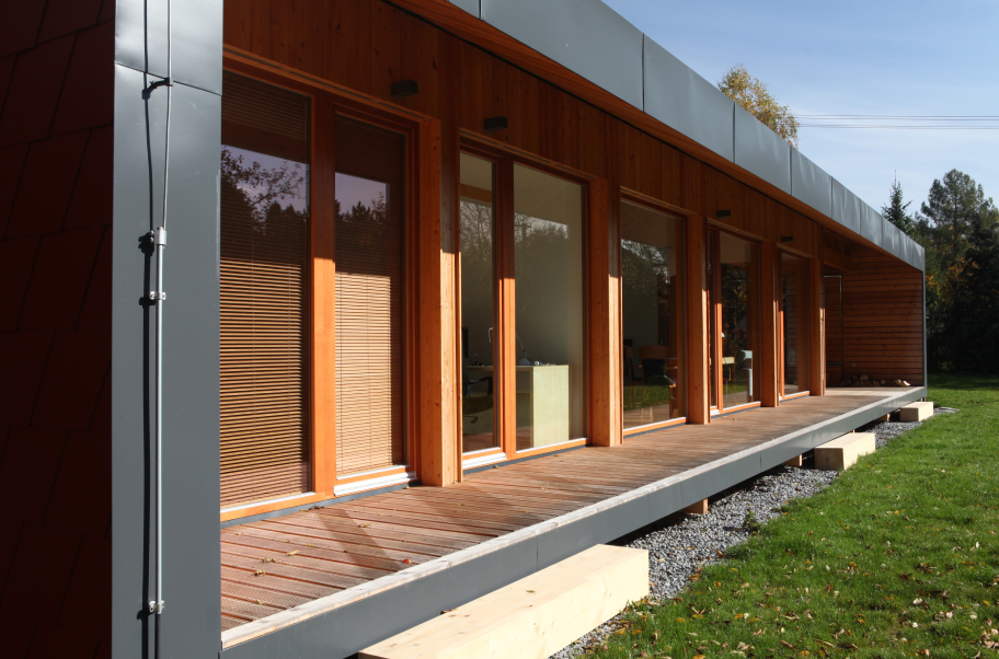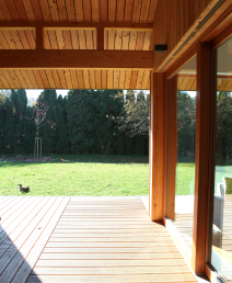 Na obytnou část objektu v přízemí navazuje krytá terasa, která pokračuje rampou do zahrady