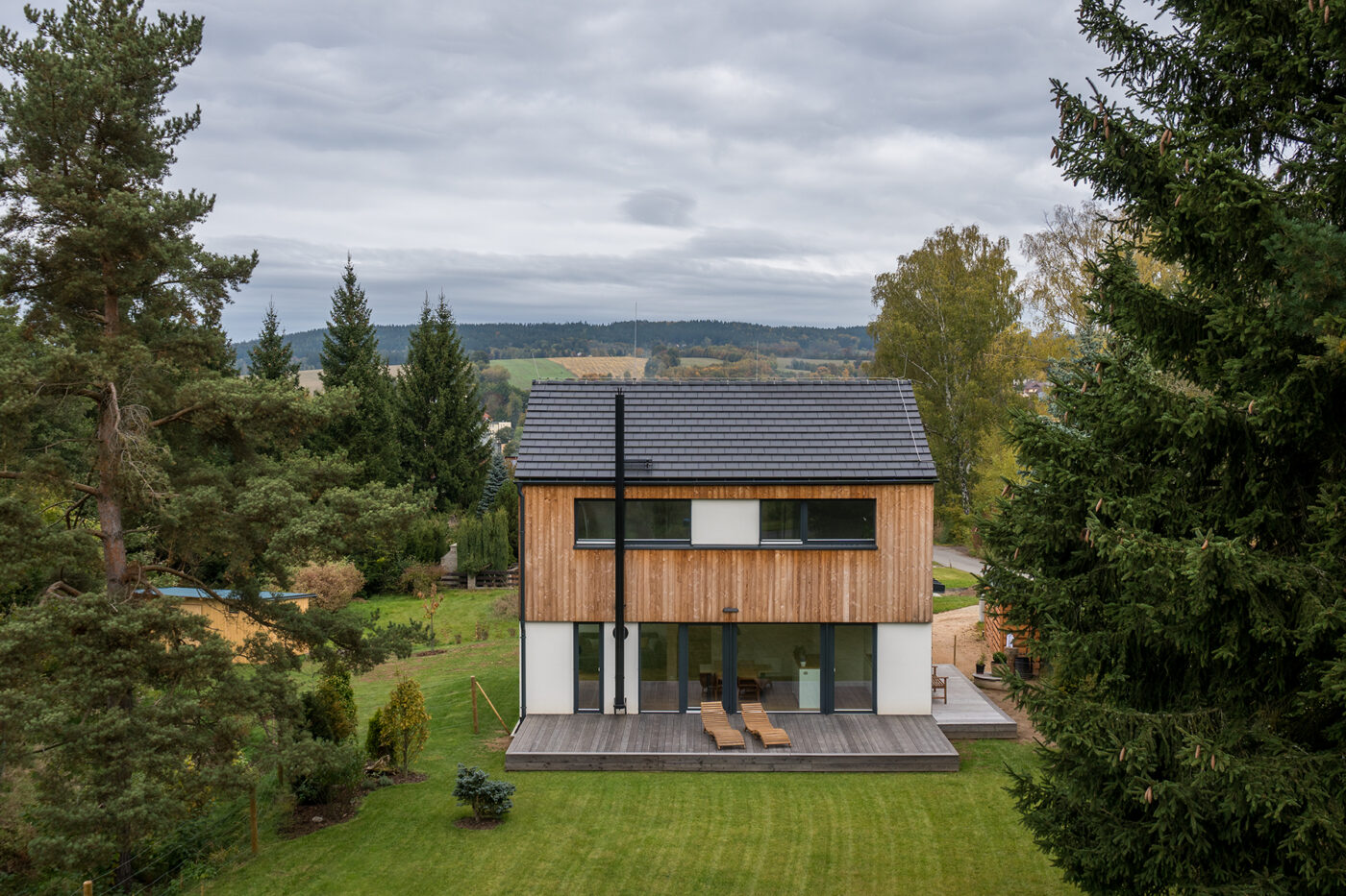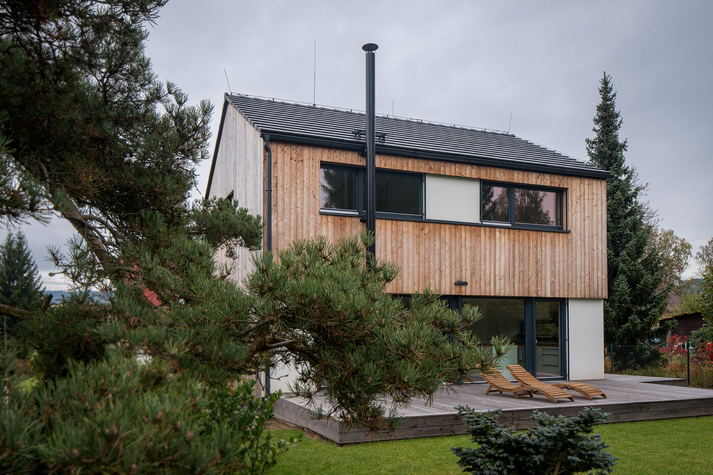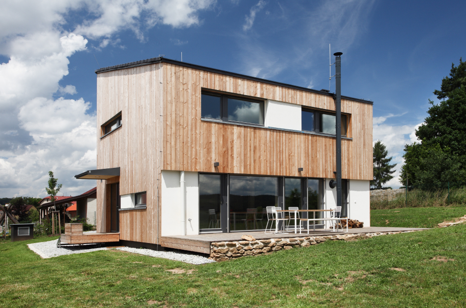 Neo je energeticky velmi úsporná patrová typová dřevostavba na klíč ve tvaru obdélníku s pultovou střechou.