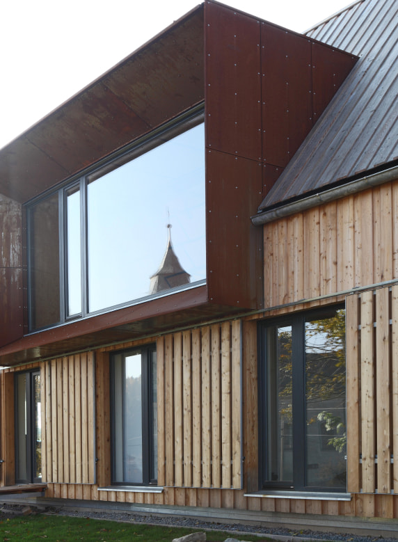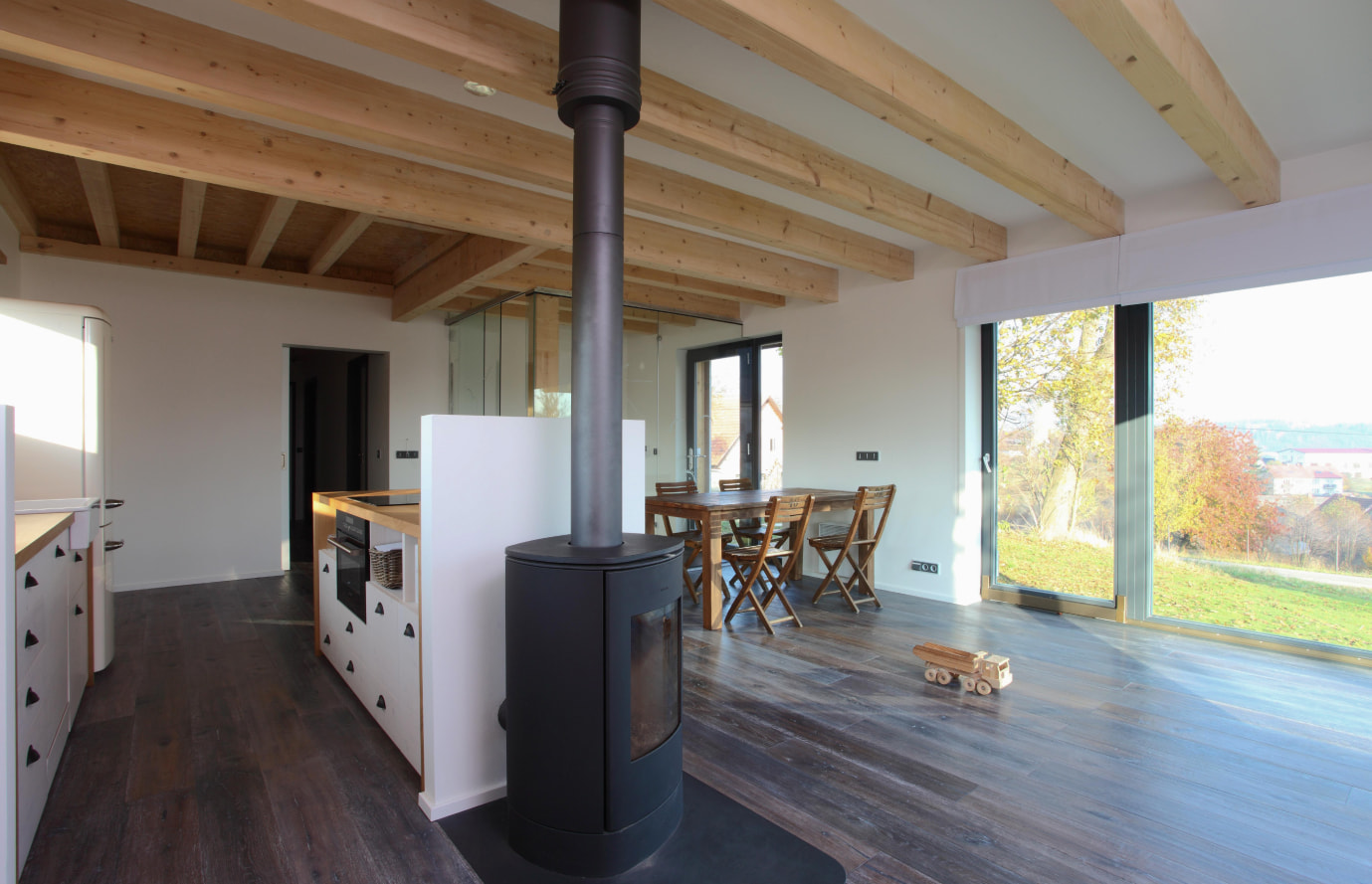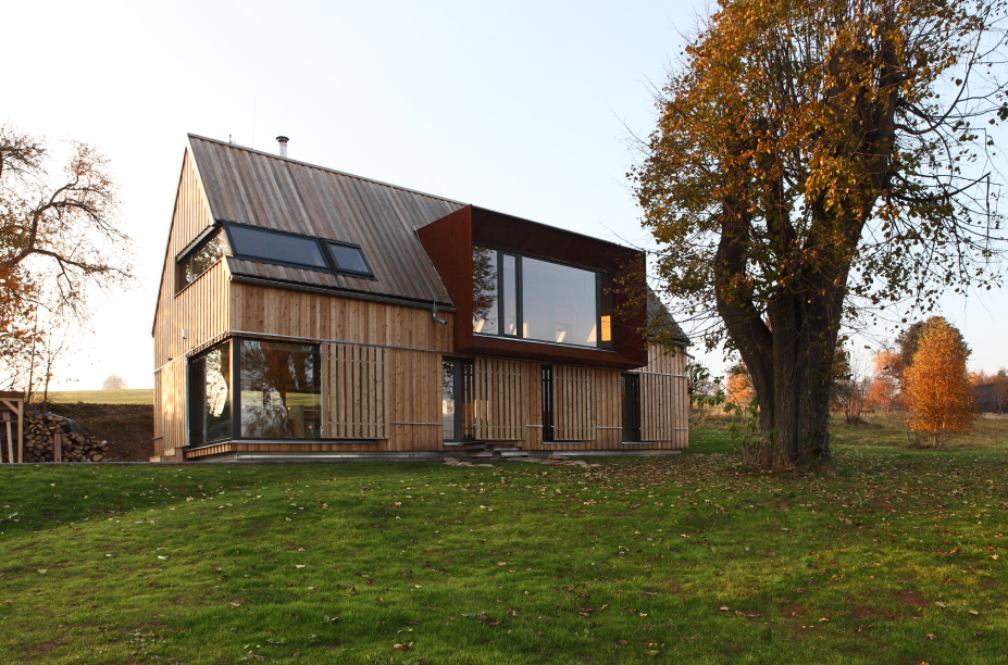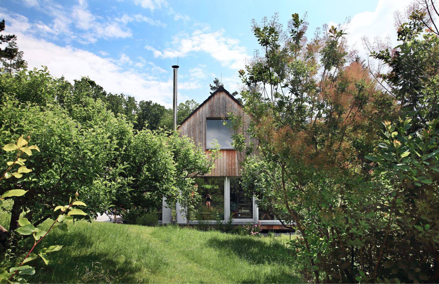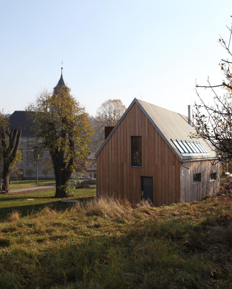 Víkendový dům pro rodinu s dvěma dětmi stojí na krásném mírně svažitém pozemku v centrální části menší obce v Jizerských horách, poblíž barokní fary, kostela a bývalé školy.