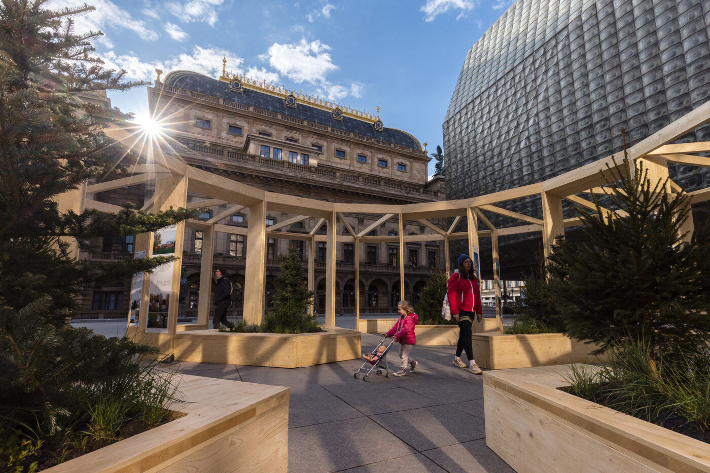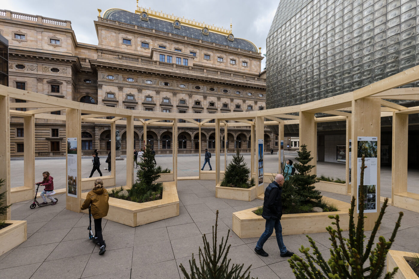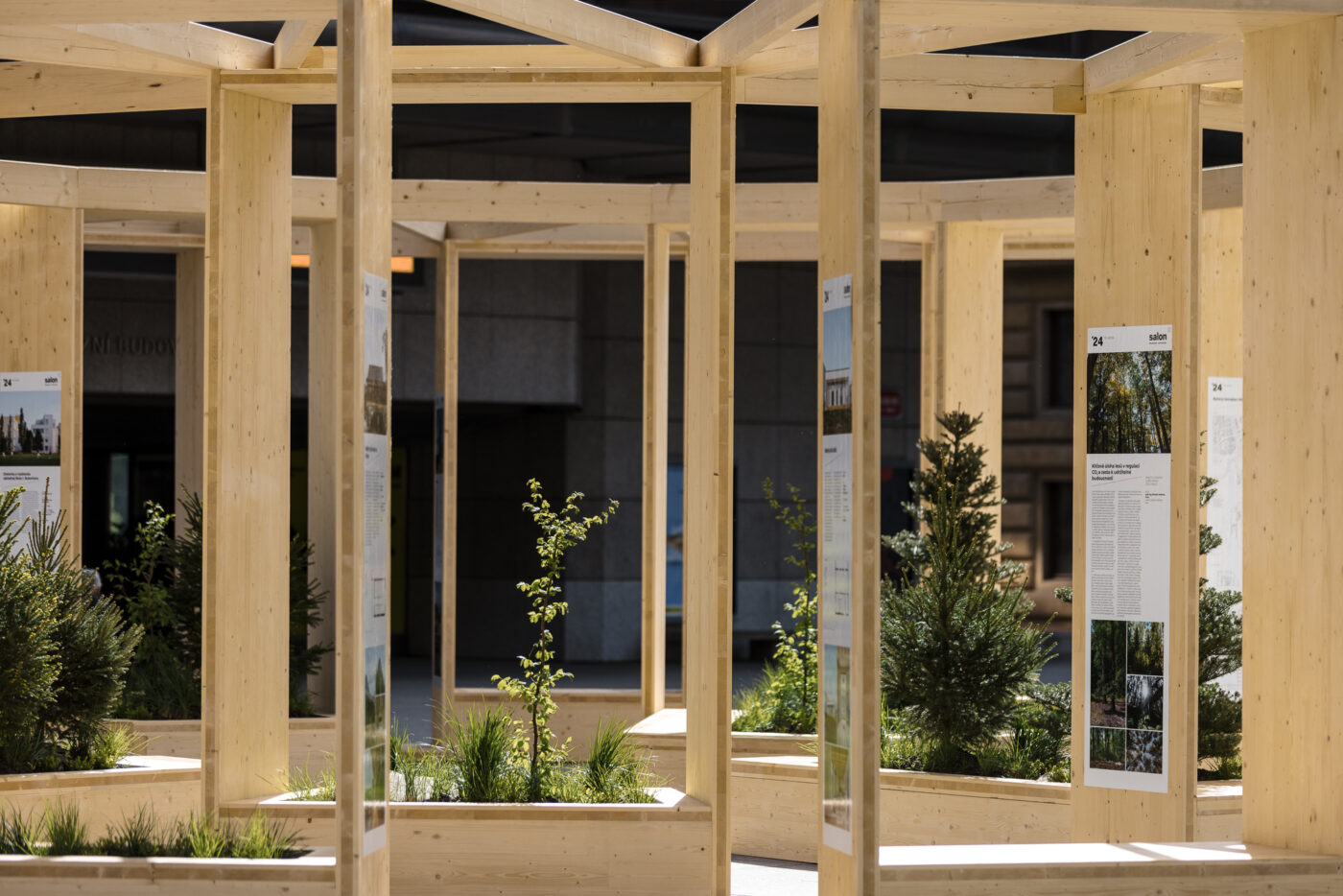 Návrhu instalace ročníku 2024 na piazzettě Národního divadla (náměstí Václava Havla), se ujal tým architektů z Prodesi/Domesi, kteří ve spolupráci se zahradními architekty z atelieru Partero vytvořili monumentální kruhový pavilon doplněný živými stromy a rostlinami. Na začátku si položili otázku, jak prostor náměstí co nejlépe doplnit a zkvalitnit jeho možnosti využití. A protože je piazzetta u Národního divadla náměstím tradičního tvaru, které je jinak prázdné, bez zeleně, sezení či místa k zastavení, vznikla výzva toto na čas změnit. Zahradní architekti z Partera kruhový pavilon doplnili o osázené truhlíky s posezením. Tvar truhlíků symbolizoval polínka rozštípnutého špalku, který po složení tvoří celek – půdorysně kruh. V truhlících zahradnický tým vysázel rostliny charakteristické pro český les – smrčky, jedle, buky, borůvky, vřes a typické traviny.