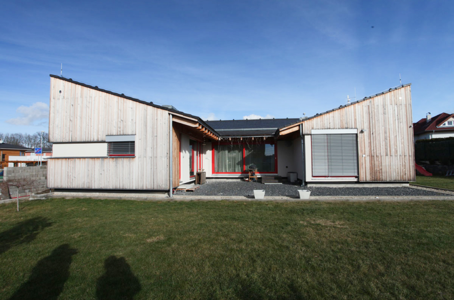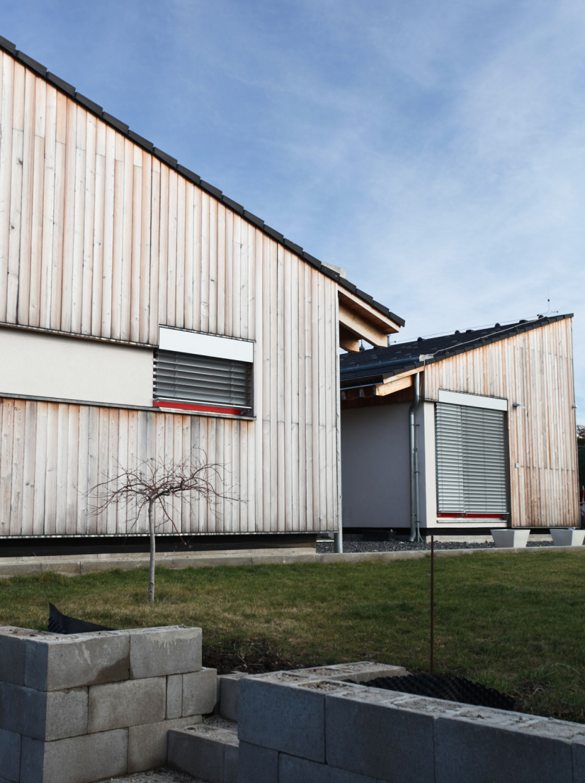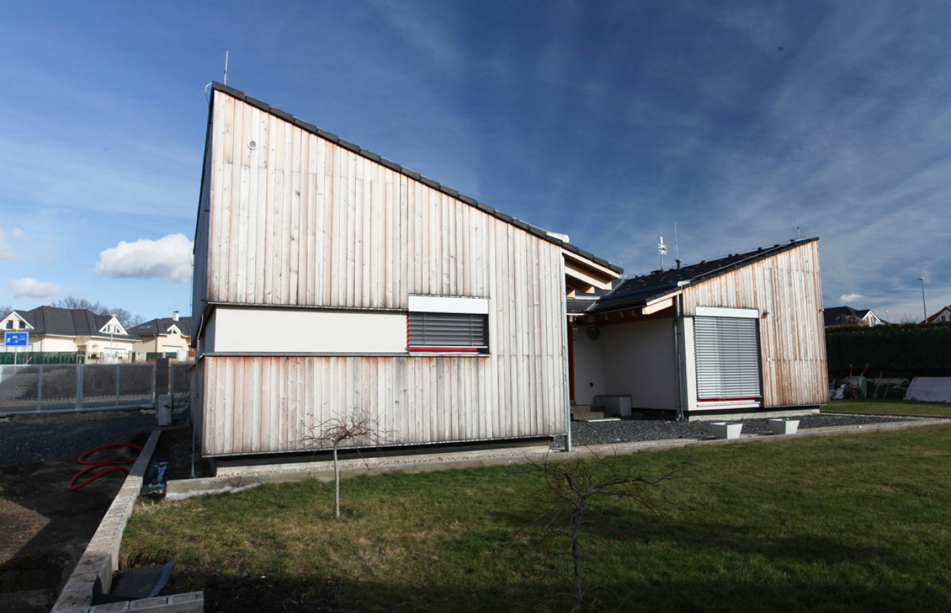 Jednotlivá křídla objektu mají stejný příčný profil a pultové střechy tak vytvářejí jednotnou linii. Díky přesahům pultové střechy je atrium částečně zastřešeno. Dům je velkými prosklenými okny maximálně otevřený na jihozápad – do zahrady, odkud je přístup také na atriovou terasu.